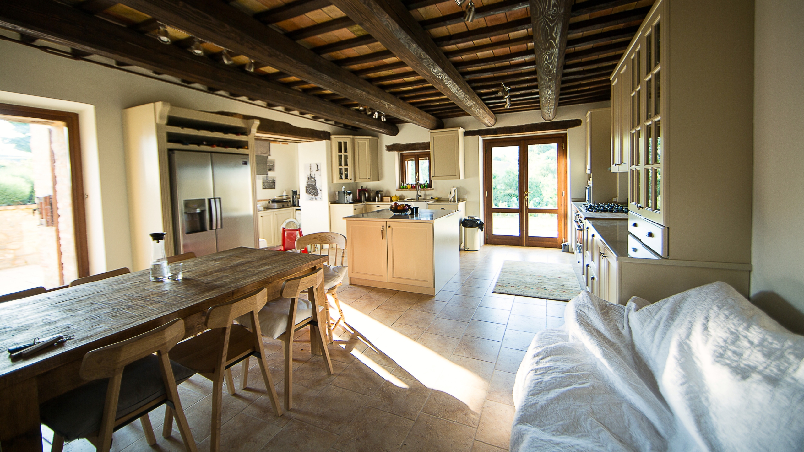 Das Erdgeschoss verfügt über einen Eingangsbereich, an den die 50 Quadratmeter große Küche und das 65 Quadratmeter Wohn-/ Esszimmer angrenzen sowie die Steintreppe, die in den ersten Stock führt. Am Anfang der Treppe erreicht man durch einen Zugang das Studio, welches über einen eigenen Zugang und ein Duschbad verfügt. Das Wohn-/Esszimmer ist der größte Raum des Hauses, der mit Kamin (großem Holzofen), großen Fenstern mit einer unglaublichen Aussicht auf die umliegenden Hügellandschaften, Deckenholzbalken und gemütlichen Sofas zum Entspannen ausgestattet ist. Dies verschafft ihm einen einzigartigen Eindruck und ist das Besondere an diesem Haus, reich an Geschmack und Größe. Das Erdgeschoss verfügt über Keramikböden mit Fußbodenheizung, die voneinander getrennt sind und separat aktiviert werden können.
